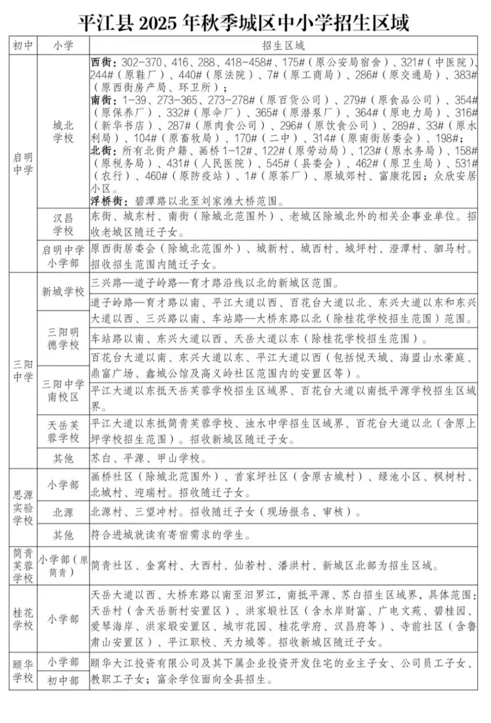 注: 1、部分学校实行一校多区办学模式。简青芙蓉学校小学部设原简青芙蓉学校、初中部设原杨梓山学校;三阳中学设北校区(原三阳中学)和南校区(杨源校区),2025年秋季北校区不招收七年级学生,南校区招收一、七年级学生,南校区现七年级学生调整至北校区就读八年级。 2、为满足学生就近入读等多元需求,城北学校与新城学校、新城学校与三阳明德学校、三阳明德学校与三阳中学南校区小学部之间的部分区域实行多校划片(具体见上表)。 |