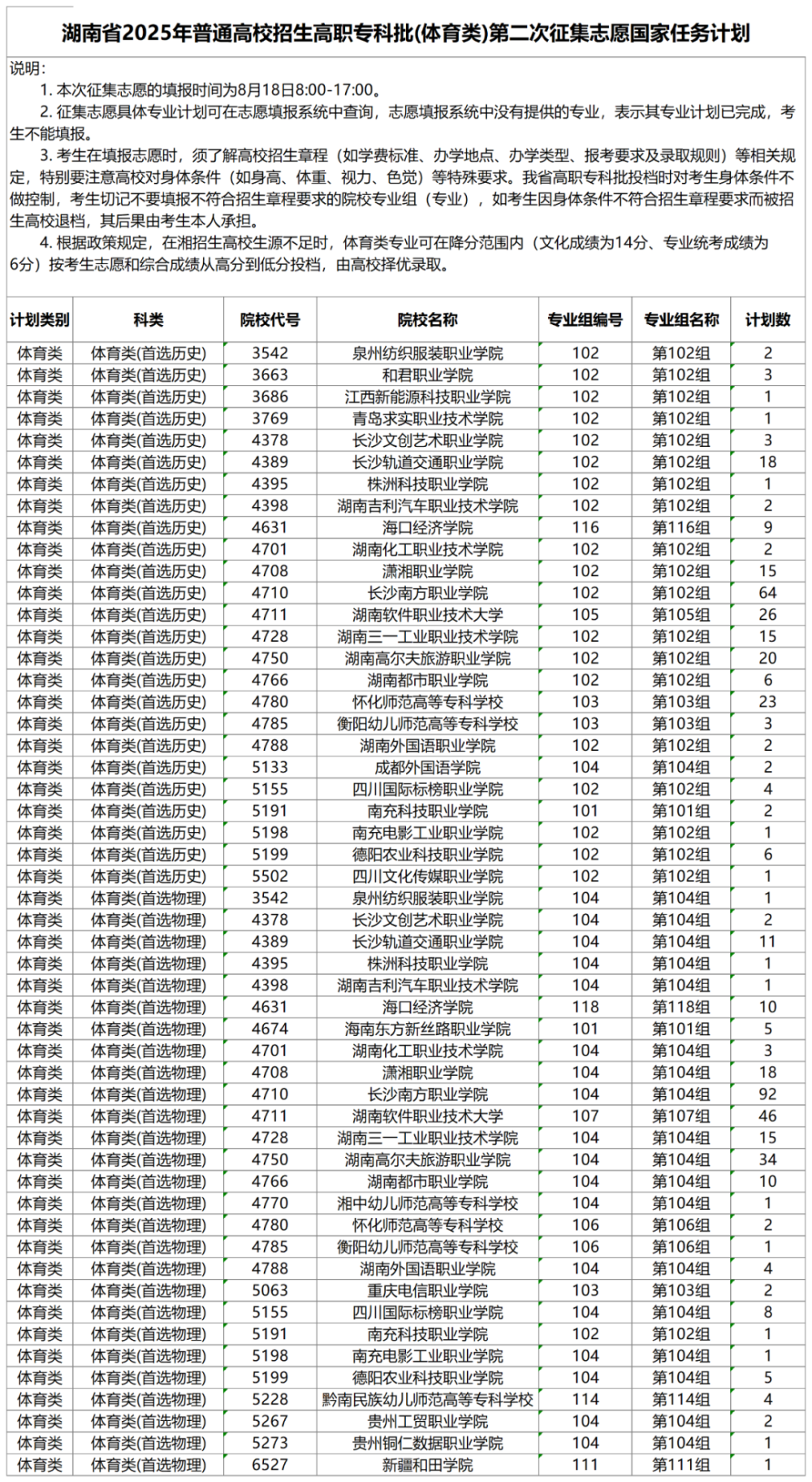 湖南省2025年普通高校招生高职专科批(体育类)第二次征集志愿国家任务计划
