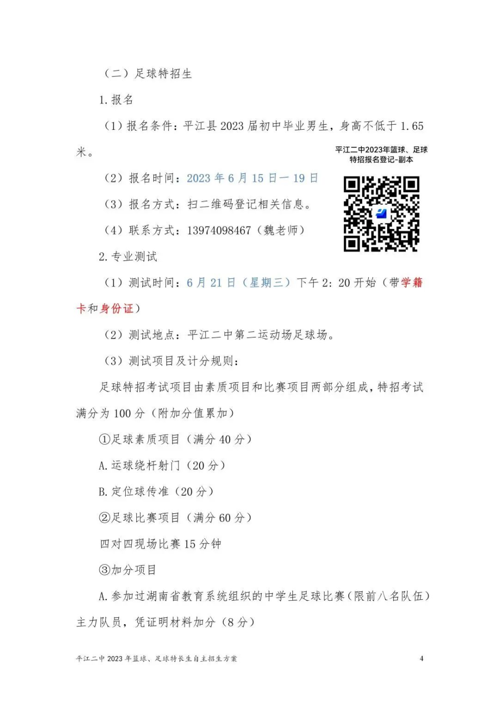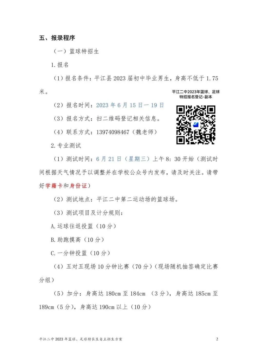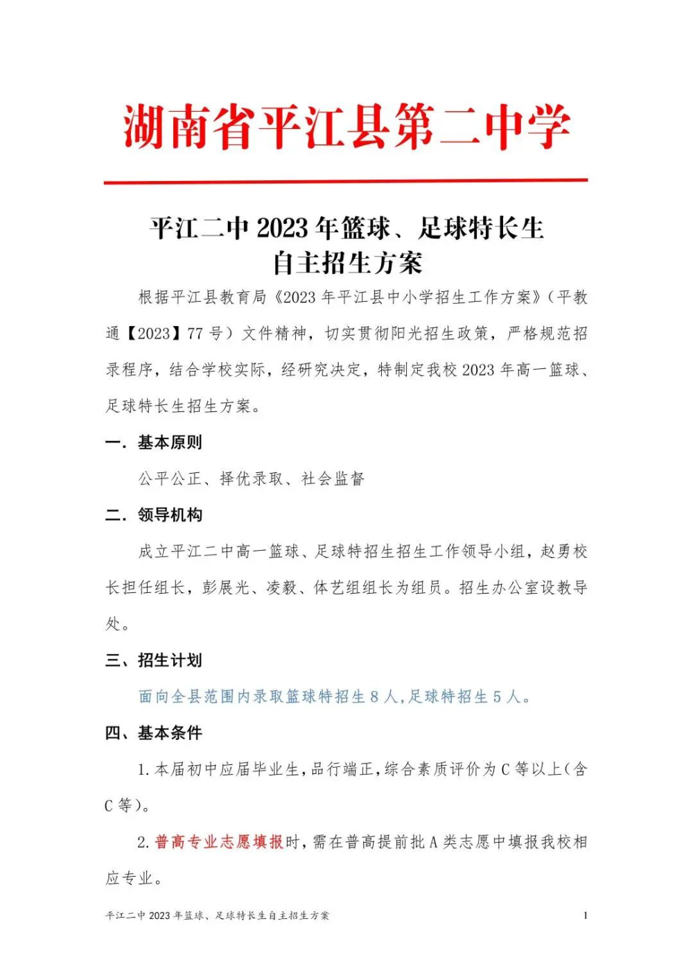 平江二中2023年篮球、足球特长生自主招生方案