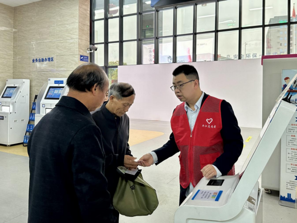 活动现场,志愿者们引导进厅办事群众,特别是老年人等特殊群体使用大厅信息化自助设备。协助老年人使用自助设备办理征信报告打印、免费拍照、养老保险查询等业务。同时向老年人普及网络安全知识,提醒他们注意防范电信诈骗,让老年人尽快适应并融入智慧政务生活。